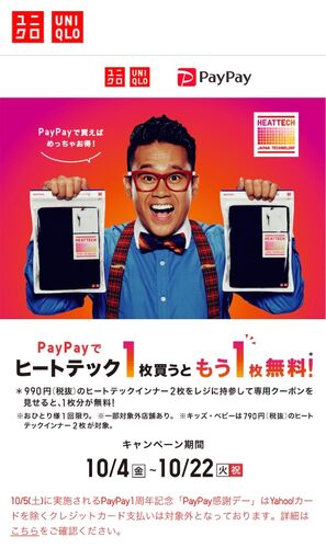 お久しぶりですUNIQLOに何気なしに寄って、いろいろ見て、 ウルトラダウンジャケット買おうと レジに並んでいると、ヒートテック1枚無料! PayPayでの支払い!の、広告も文字が目に飛び込んできて、 一週間ほど前にダウンロードしたばかりのPayPayで なんと…